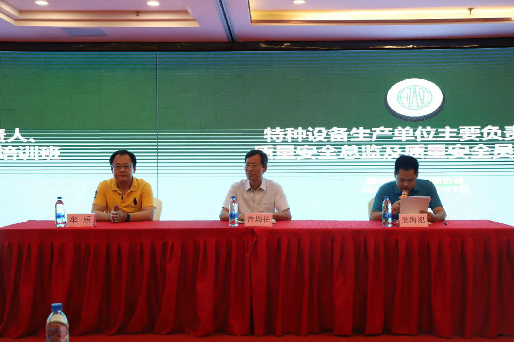 惠州市特种设备协会举办特种设备生产单位主要负责人、质量安全总监及质量安全员培训班 为帮助特种设备生产单位落实企业主体责任,提升企业安全管理水平,助力企业配置质量安全总监及质量安全员,惠州市特种设备协会2023年8月16日至17日举办第一期特种设备生产单位主要负责人、质量安全总监及质量安全员培训及能力水平测试。8月16日惠州市特种设备协会会长吴海泓主持开班仪式,广东省特种设备检测研究院惠州检测院院长曾均长作动员讲话。协会专门邀请了广州特种设备承压设备检测研究院高级工程师牟乐和广东省特种设备检测研究院国家电梯中心高级工程师闫宾担任本次培训班授课讲师,特种设备生产单位主要负责人及相关人员等170人参加了本次培训,培训内容充实,取得圆满效果。