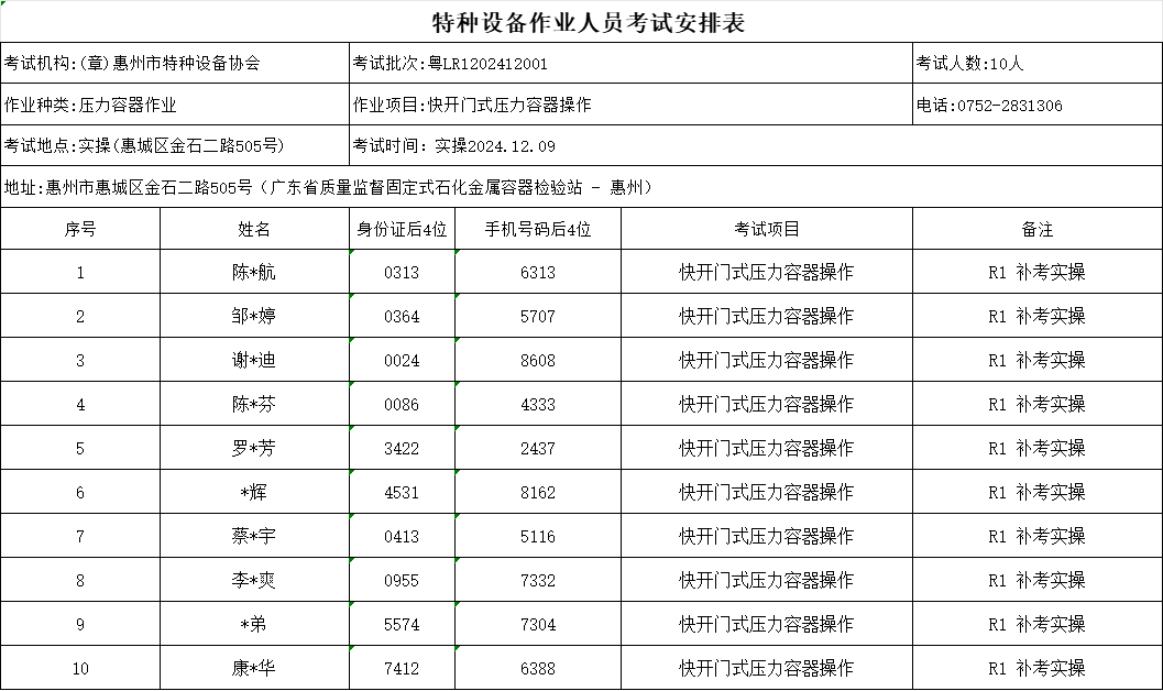 快开门式压力容器操作(批次:粤LR1202412001)考试安排表