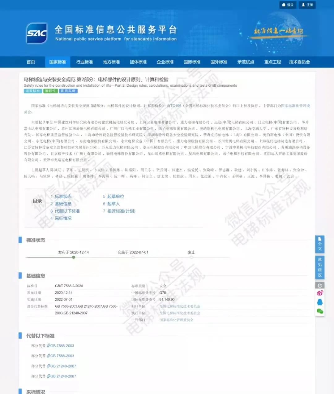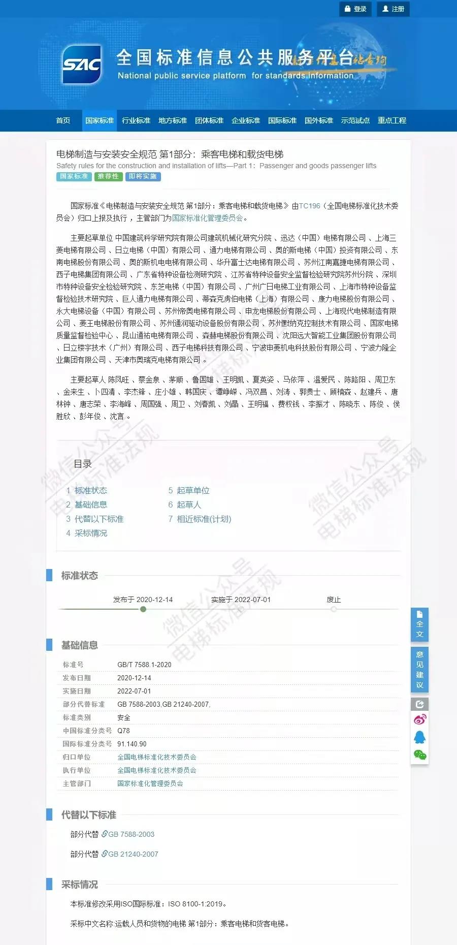 日前,国家标准化技术委员会网站正式公布GB/T 7588.1-2020《电梯制造与安装安全规范 第1部分:乘客电梯和载货电梯》、GB/T 7588.2-2020《电梯制造与安装安全规范 第2部分:电梯附件的设计原则、计算和检验》。