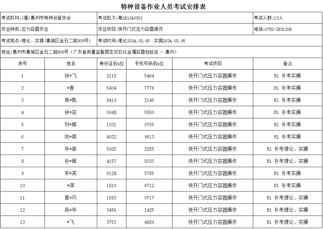 快开门式压力容器操作(批次:粤LR1202412001)考试安排表