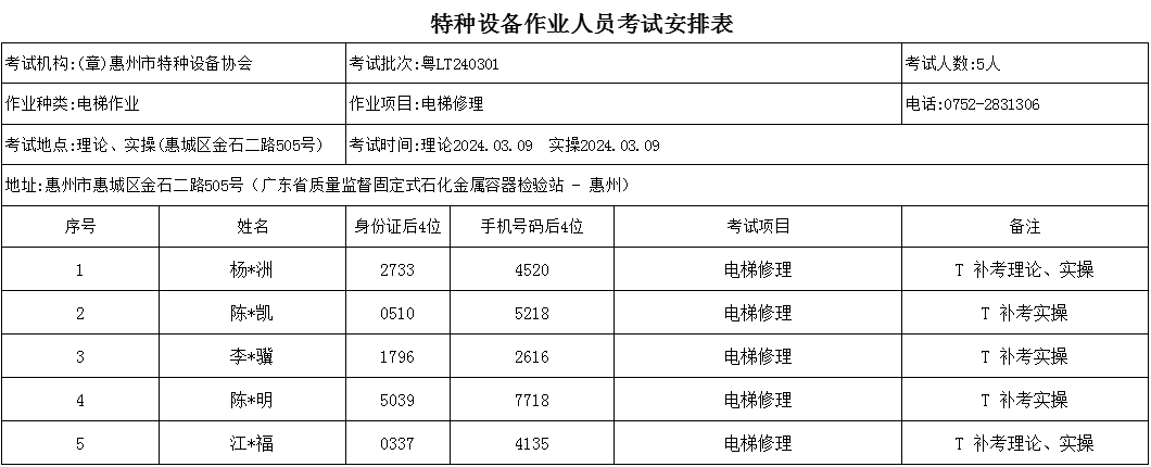 快开门式压力容器操作(批次:粤LR1202412001)考试安排表