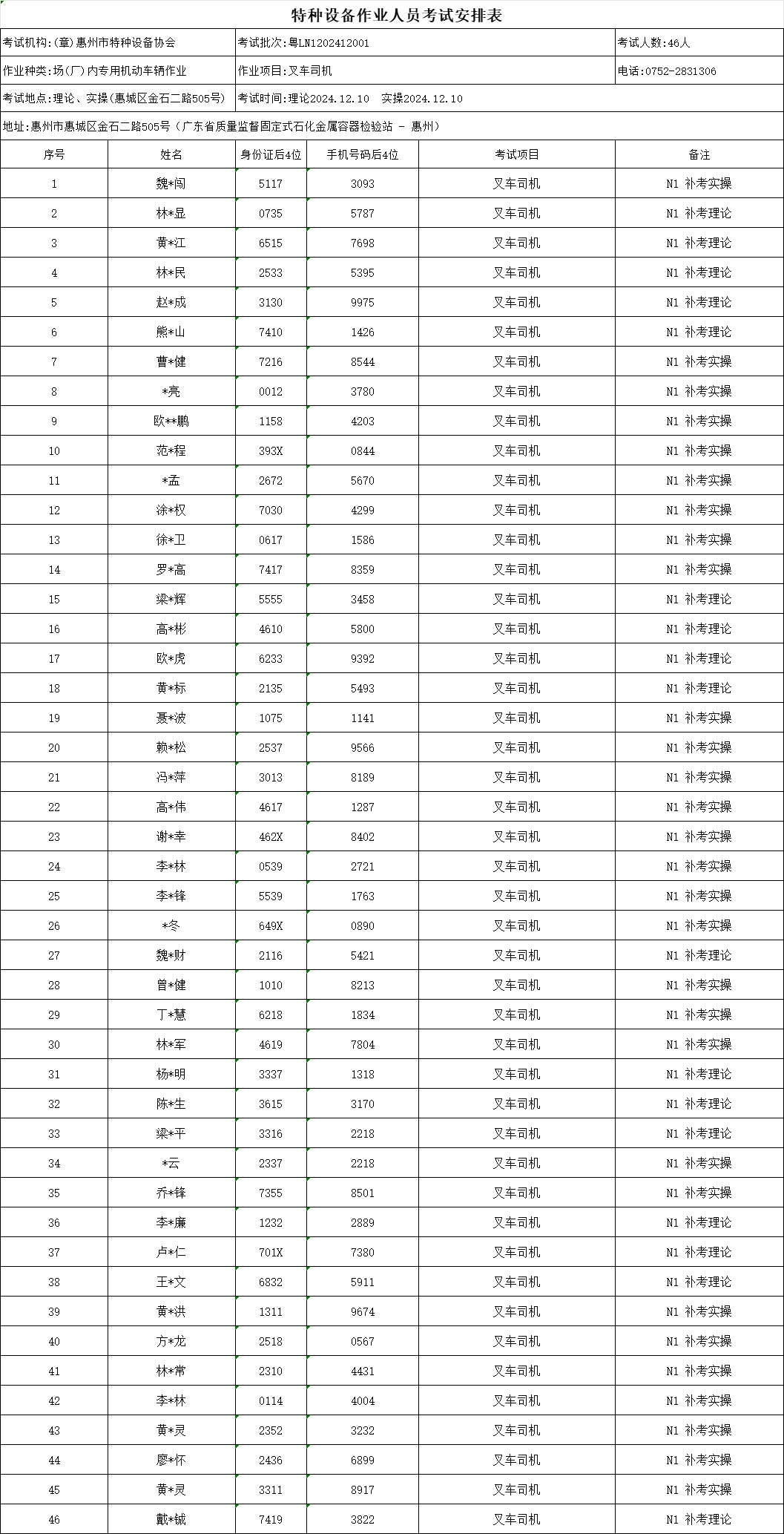 移动式压力容器充装(批次:粤LR2202412001)考试安排表