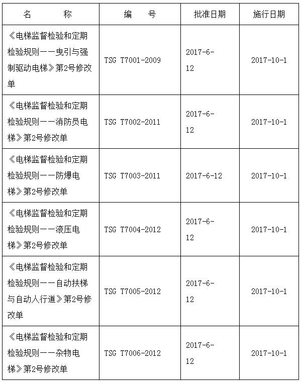 附件:1. 《电梯监督检验和定期检验规则——曳引与强制驱动电梯》(TSG T7001-2009,2013年第1次修改)第2号修改单 2.《电梯监督检验和定期检验规则——消防员电梯》(TSG T7002-2011,2013年第1次修改)第2号修改单 3.《电梯监督检验和定期检验规则——防爆电梯》(TSGT7003-2011,2013年第1次修改)第2号修改单 4.《电梯监督检验和定期检验规则——液压电梯》(TSGT7004-2012,2013年第1次修改)第2号修改单 5.《电梯监督检验和定期检验规则——自动扶梯与自动人行道》(TSG T7005-2012,2013年第1次修改)第2号修改单 6.《电梯监督检验和定期检验规则——杂物电梯》(TSGT7006-2012,2013年第1次修改)第2号修改单 质检总局 2017年6月12日