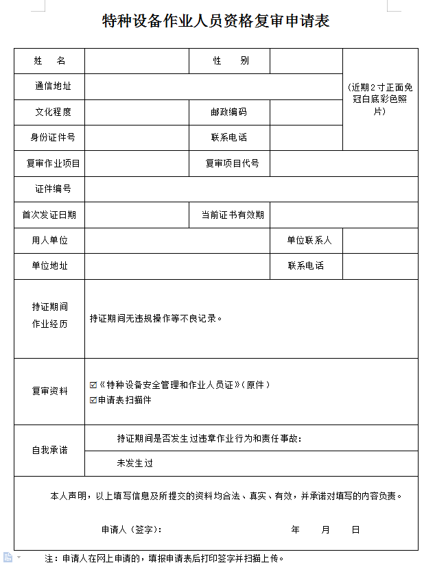 3.代办应提供的资料: (1)《特种设备作业人员复审申请表》; (2)《特种设备安全管理和作业人员证》原件; (3)近期2寸正面免冠白底彩色照片(2张); 快递地址:惠州市惠城区惠州大道(江北段)156-1号4楼402房 叶工 18923655538 4.持证人如需快递证件,可与客服联系。